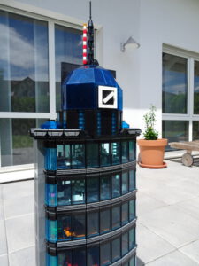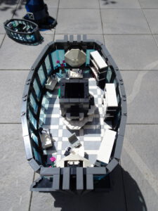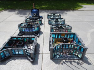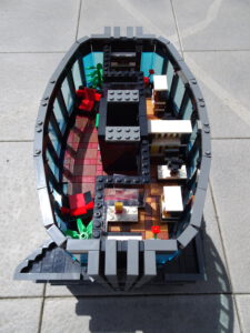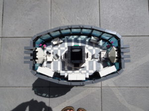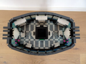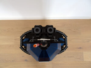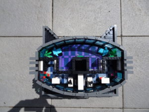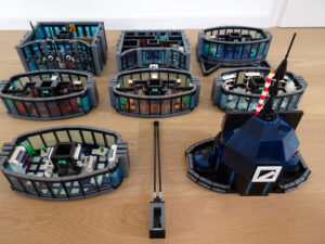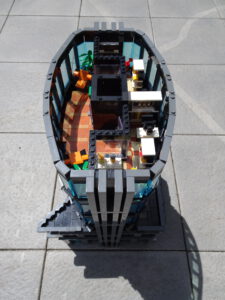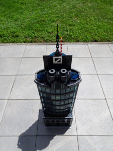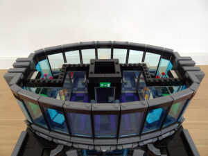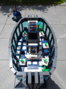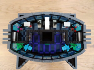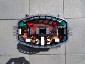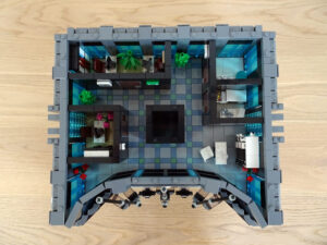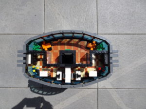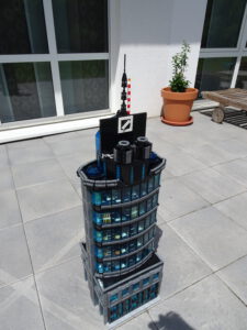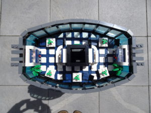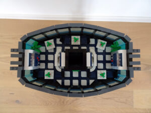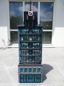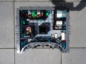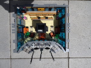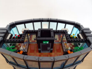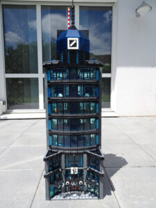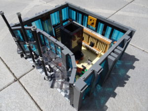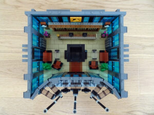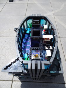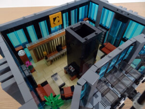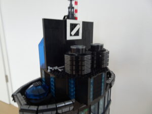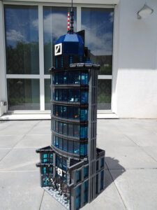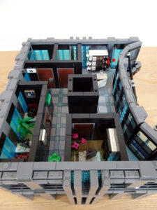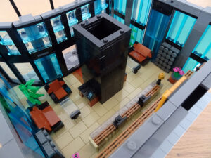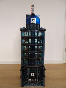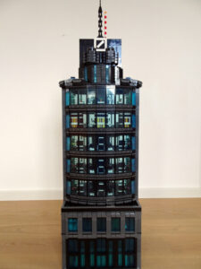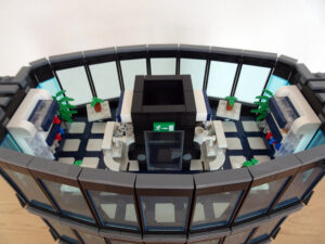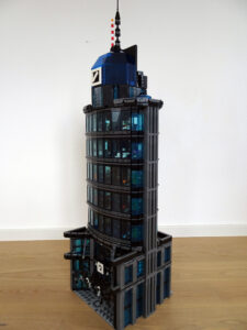 Dieses Hochhaus-MOC wurde von verschiedenen Wolkenkratzern großer Metropolen inspiriert, zum Beispiel von zahlreichen Bankgebäuden in Frankfurt am Main. Es besteht aus insgesamt sieben Stockwerken plus Dach. Zugänglich sind die Etagen durch den zentralen Fahrstuhlschacht. Das Erdgeschoss enthält die Bankräume, im ersten Stock befinden sich mehrere kleinere Büroräume. Die folgenden fünf Etagen sind im Grundriss baugleich. In drei davon sind weitere Büroräume, im fünften eine Art Archiv bzw. Bibliothek und im sechsten die obligatorische Cafeteria. Das Dach habe ich aus den guten alten Scheiben der 80iger-Jahre Weltraum-Monorail gebaut. Die größte Herausfoderung war es, die ovale Form der Etagen zu gestalten, wie immer hat das mit Hinge-Plates ganz gut funktioniert.