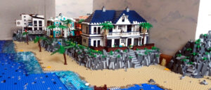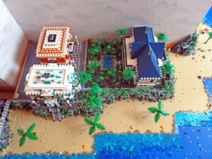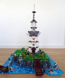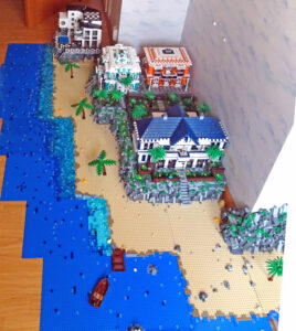 In einem alten LEGO®-Strand-Entwurf habe ich zwei meiner MOCs eingebaut, das Kolonialherrenhaus und die Strandvilla. Wegen Umzugs musste ich den Strandabschnitt dann aber zerlegen. Ausserdem hatte ich nicht mehr genug Trans-Blue-Fliesen, um den Ozean fertigzustellen. Der Leuchtturm entstand parallel. Er sollte auf einer kleinen Insel vor der Küste stehen. Als Entwurf für eine tropische Landschaft in naher oder ferner Zukunft könnte das Szenario im wahrsten Sinne „ausbaufähig“ sein…