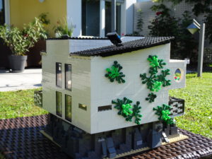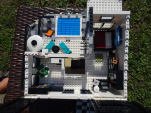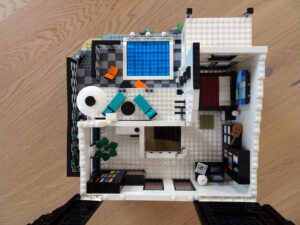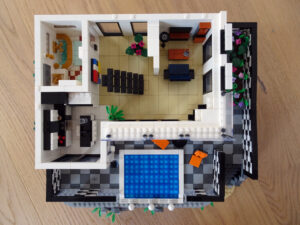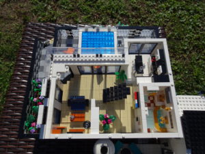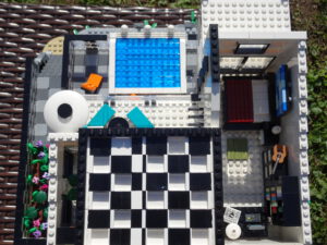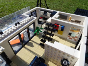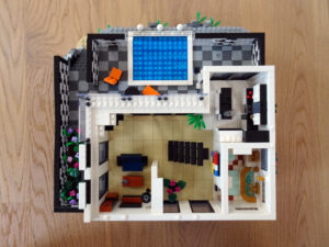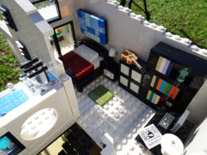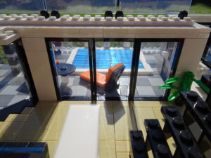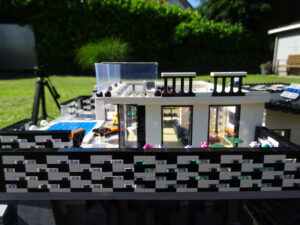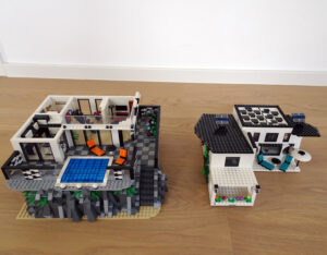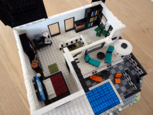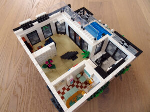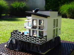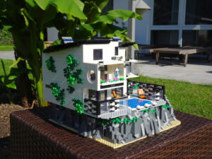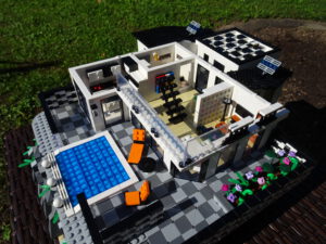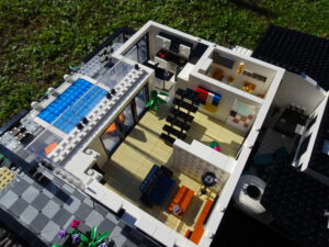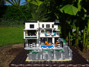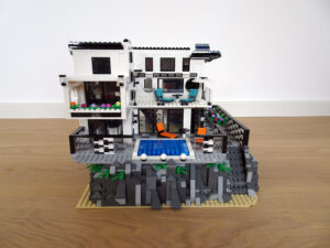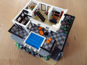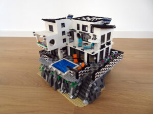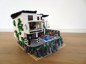 Dieses MOC ist einer modernen Luxusvilla am Strand nachempfunden. Auf einer leicht erhöhten Felsbasis erbaut umfasst es ein großzügiges Erdgeschoss mit moderner Küche und Wohnbereich, der auf die große Terrasse mit Infinity-Pool führt. Außerdem gibt es ein Wohlfühl-Spa-Bad. Oben sind Schlaf- und Arbeitszimmer in einer Art Galerie angelegt. Inspiriert haben mich Luxusvillen an der kalifornischen Küste und in Florida.