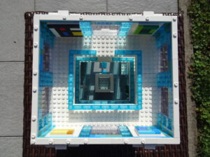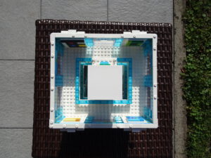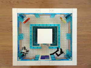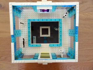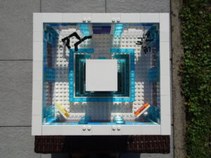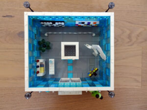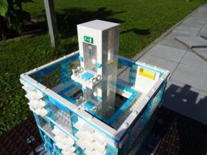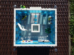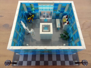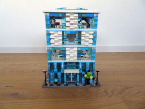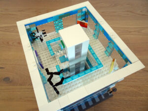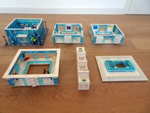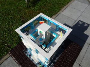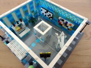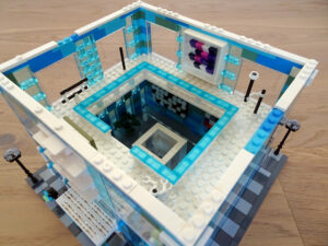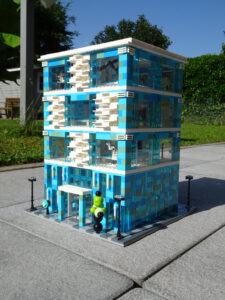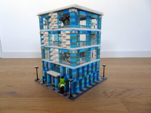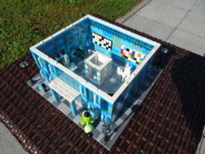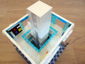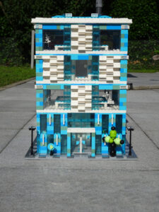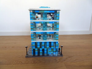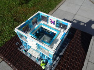 Das Museum für moderne Kunst soll architektonisch den in vielen modernen Kunstrichtungen typischen Minimalismus widerspiegeln. Als Fassade habe ich Blau- und Azursteine mit Olivfarbe benutzt, hauptsächlich aber viele Glaselemente. Den Fahrstuhlschacht habe ich diesmal als einen herausnehmbaren Block gestaltet. Ansonsten ist noch Raum für weitere moderne Kunstwerke…
