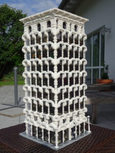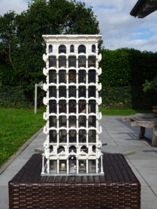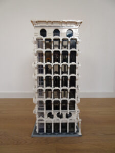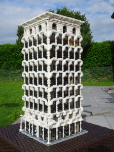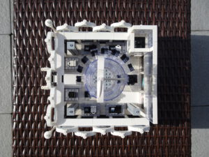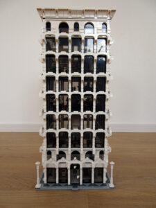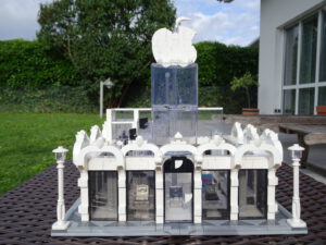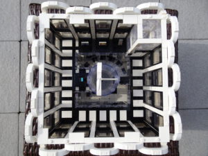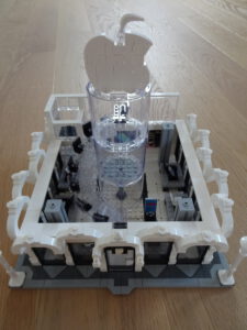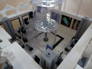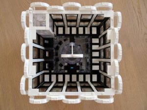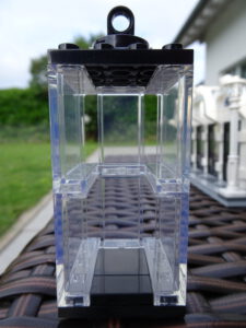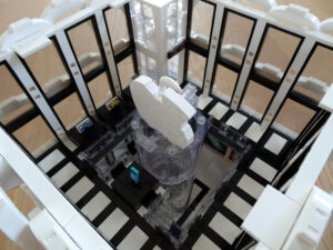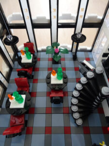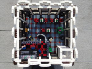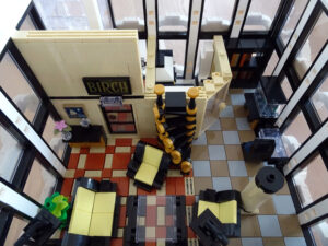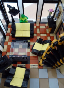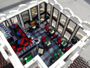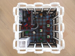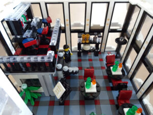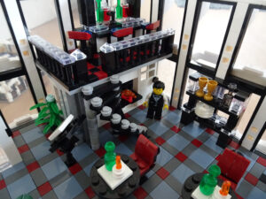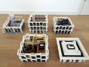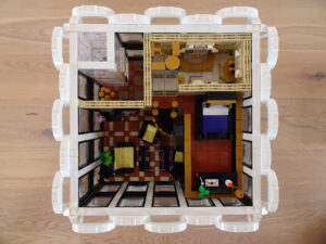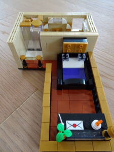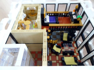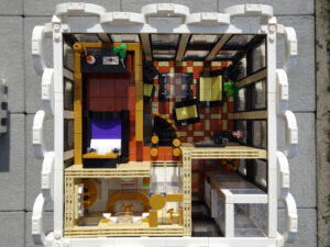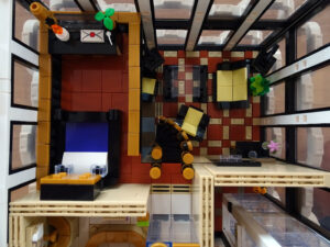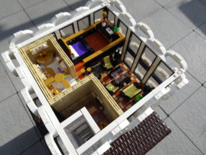 Mein erstes Hochhaus-MOC besteht aus vier Modulen plus Dach. Einige erkennen im Erdgeschoss und dem ersten Stock bestimmt den Apple-Store, der vor Jahren von einem alternativen Klemmbausteinhersteller herausgebracht wurde. Ich habe die Reste davon zusammen mit anderen alten Sets online gekauft und die Teile für das Geschäft unten verwendet. Durch die Fassadengestaltung von zwei Fensterreihen pro Etage entsteht der Eindruck von mehreren Stockwerken, tatsächlich sind es nur drei. Eine Herausfoderung war der gläserne Aufzugsschacht in der linken hinteren Ecke, über den die Etagen zugänglich sind. Am meisten Spass gemacht hat die Gestaltung des Luxusapartments ganz oben. Ich habe versucht, die Stockwerkhöhe für eine Art Penthouse bzw. Maisonette-Wohnung zu nutzen.