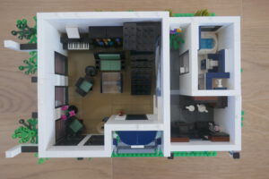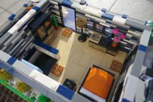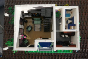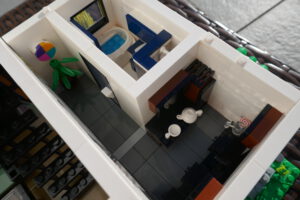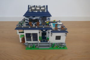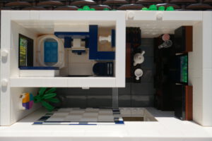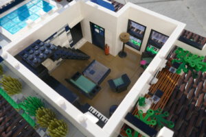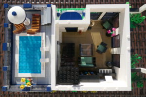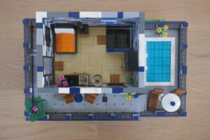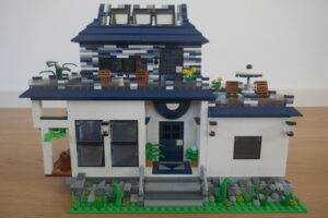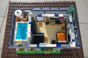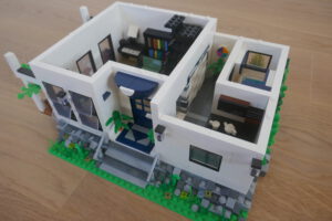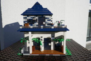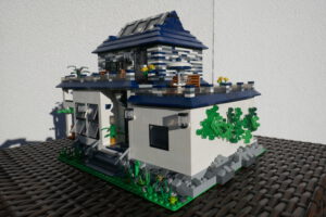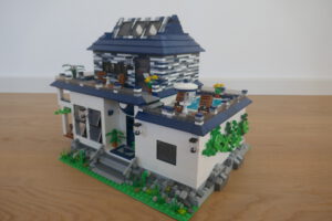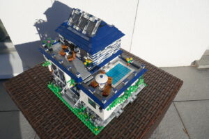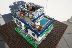 Nach längerer Pause habe ich wieder einmal versucht, ein Wohnhaus, genauer gesagt eine moderne Stadtvilla zu bauen. Auf einer Standard 32 x 32 Baseplate, erweitert um eine 16 x 32 Baseplate, habe ich einen leicht erhöhten Sockel gebaut. Darauf ruht das Erdgeschoss mit einem großen Wohn- und Essbereich und Zugang zum Obergeschoss. Daneben sind auf kleinerer Fläche der Flur, das Bad und die Küche untergebracht. Eine Art Holzterrasse führt nach draußen. Oben ist das Schlafzimmer und ein Arbeitsbereich, dazu natürlich der Zugang zur Dachterrasse mit Pool. Ich habe stilistisch versucht eine Mischung aus traditioneller Archirektur und modernem Stil zu finden.